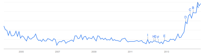 Die Einführung der umstrittenen Google Glass Brille wurde bereits Anfang 2013 eifrig diskutiert, wie man es in der Google Trends Kurve leicht ablesen kann. Smartwatches wie Samsungs GALAXY Gear oder die Apple-Watch werden garantiert die nächsten Schlagzeilen zum Thema Wearables liefern. Die meistverkauften – wesentlich weniger spektakulären – Geräte sind aber aktuell noch Fitness-Tracker wie Fitbit, Jawbone up oder Nike + Fuelband.