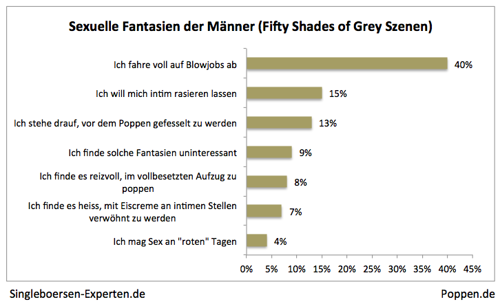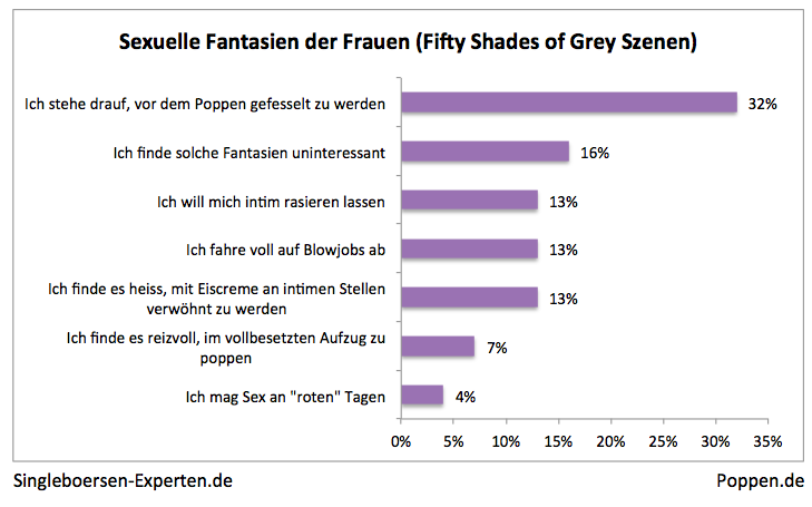 - Obwohl die Bücher großen Erfolg unter Frauen genießen konnten, ist die Affinität der Männer zu BDSM Fantasien eindeutig höher. 16% der Frauen lehnen solche Fantasien ab. Bei Männern gibt es nur 9% „Verweigerer".